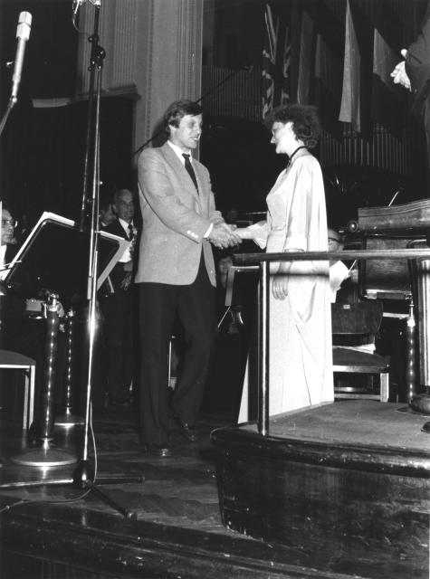 Eugeniusz Knapik składa gratulacje sopranistce Henryce Januszewskiej po wykonaniu jego utworu La Flûte de Jade wraz z Het Residentie Orkest pod dyrekcją Ernesta Boura.