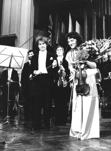 Wanda Wiłkomirska z kwiatami na estradzie Filharmonii Narodowej po wykonaniu Concerto per archi Zbigniewa Bujarskiego wraz z Polską Orkiestrą Kameralną pod dyrekcją Jerzego Maksymiuka.