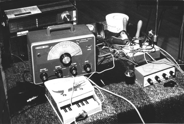 Przedmioty do wzbudzania dźwięku używane przez Johna Tilbury'ego w jego opracowaniu utworu Plus-Minus Karlheinza Stockhausena na organy, fortepian i perkusję.