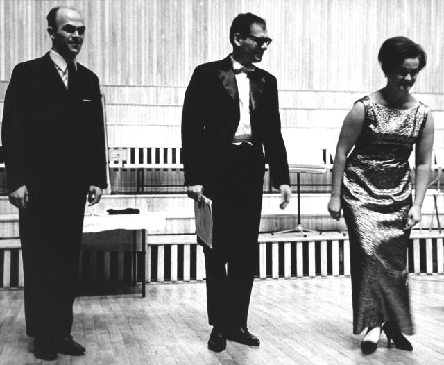 Węgierski kompozytor Miklós Kocsár, sopranistka Erika Sziklay i pianista Ádám Fellegi na scenie Sali Koncertowej Państwowej Wyższej Szkoły Muzycznej w Warszawie po wykonaniu Due Lamenti na sopran i fortepian.