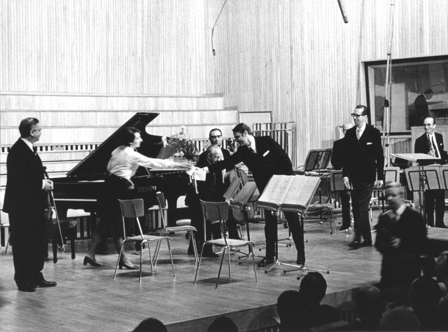 Cristóbal Halffter congratulates musicians of Grupo Alea from Madrid under the direction of José María Franco Gil after the performance of his Antiphonismói for 7 instruments.