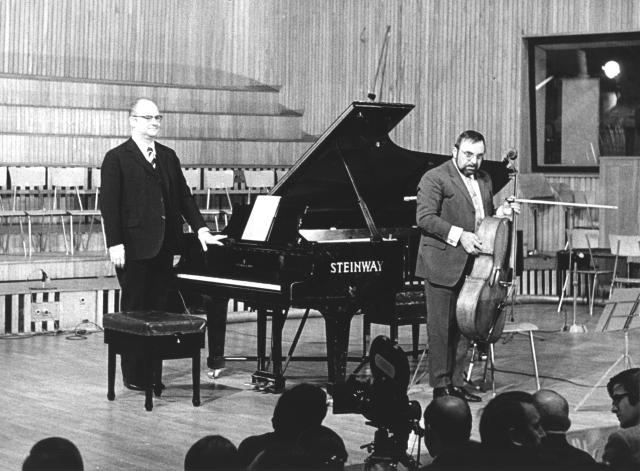 Alfons Kontarsky i Siegfried Palm po wykonaniu Trzech utworów na wiolonczelę i fortepian Edisona Denisowa.