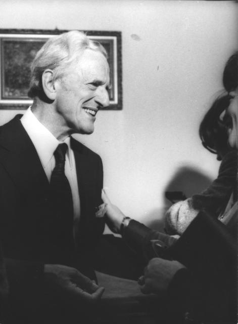 Peter Pears w kuluarach Filharmonii Narodowej w dniu koncertu, który odbył się 25 września 1975 w ramach XIX Międzynarodowego Festiwalu Muzyki Współczesnej "Warszawska Jesień".