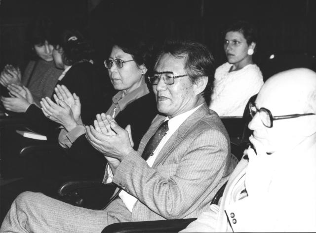 Isang Yun wśród publiczności zgromadzonej w Sali Koncertowej Filharmonii Narodowej w dniu koncertu, który odbył się 20 września 1986 w ramach XXIX Międzynarodowego Festiwalu Muzyki Współczesnej "Warszawska Jesień".