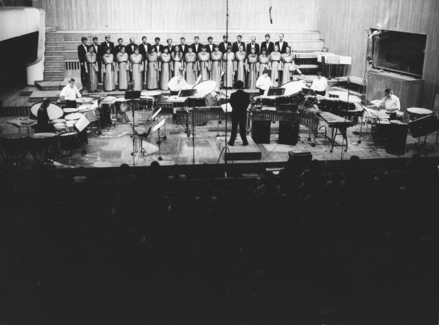 Iannis Xenakis' Idem A, Idmen B performed by the Warsaw Percussion Group and the Polish Chamber Choir Schola Cantorum Gedanensis under the direction of Jan Łukaszewski.