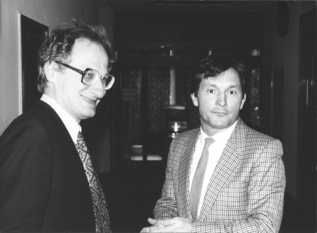 Krzysztof Meyer i Zygmunt Krauze w kuluarach Sali Koncertowej Akademii Muzycznej im. Fryderyka Chopina w dniu koncertu, który odbył się 28 września 1986 w ramach XXIX Międzynarodowego Festiwalu Muzyki Współczesnej "Warszawska Jesień".