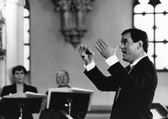 Marcus Creed dyryguje RIAS Kammerchor z Berlina Zachodniego podczas koncertu, który odbył się 17 września 1989 w Kościele Ewangelicko-Reformowanym w Warszawie w ramach XXXII Międzynarodowego Festiwalu Muzyki Współczesnej "Warszawska Jesień".