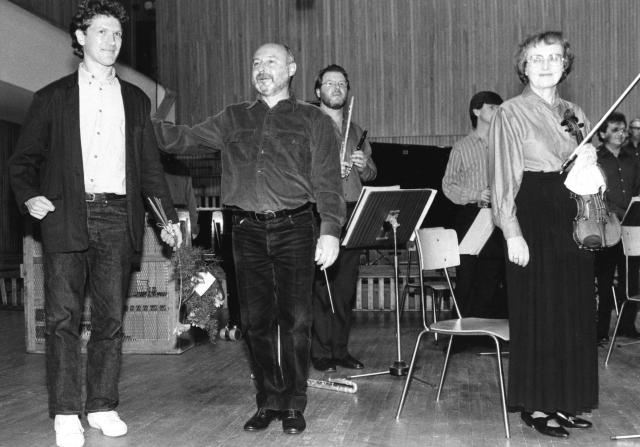 Hans Abrahamsen na estradzie Sali Koncertowej Akademii Muzycznej im. Fryderyka Chopina po wykonaniu jego utworu Märchenbilder przez London Sinfoniettę pod dyrekcją Diego Massona.