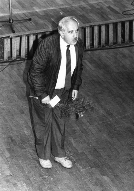 Stanisław Moryto na estradzie Sali Koncertowej Akademii Muzycznej im. Fryderyka Chopina po wykonaniu jego utworu Per uno solo na perkusję przez Stanisława Skoczyńskiego.