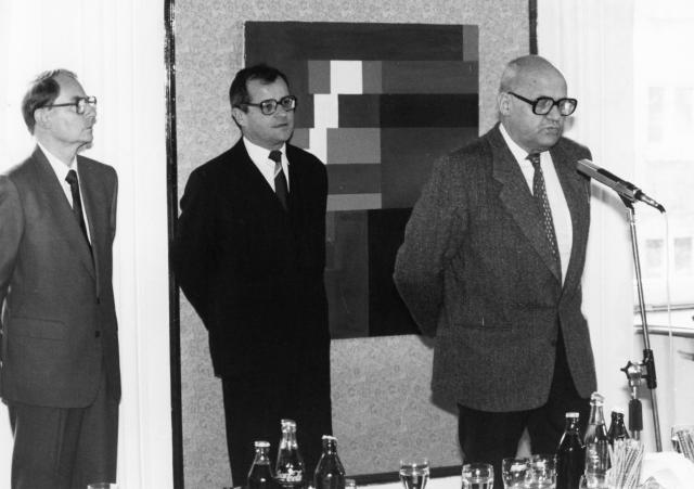 Józef Patkowski przemawia podczas bankietu na otwarcie XXXIII Międzynarodowego Festiwalu Muzyki Współczesnej "Warszawska Jesień", który odbył się 14 września 1990 w Filharmonii Narodowej. Po lewej widoczni: Borys Frydrychowicz oraz Andrzej Chodkowski, Prezes Związku Kompozytorów Polskich.
