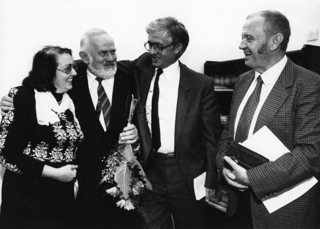 Zbigniew Bujarski przyjmuje gratulacje po koncercie, który odbył się 15 września 1990 w Sali Koncertowej Filharmonii Narodowej w ramach XXXIII Międzynarodowego Festiwalu Muzyki Współczesnej "Warszawska Jesień".