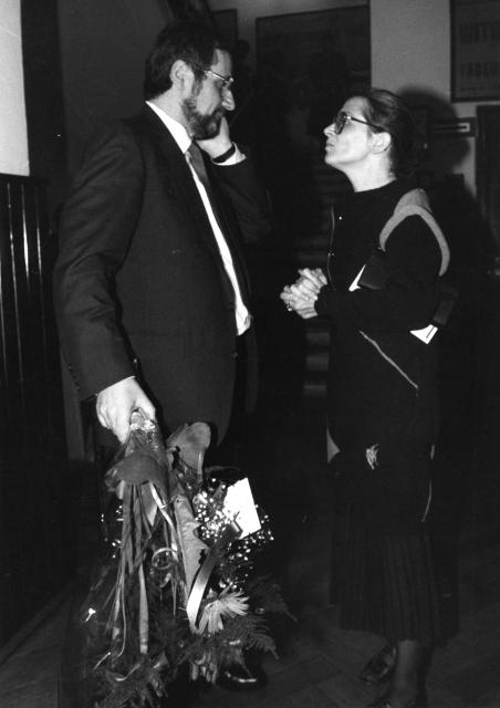Jan Radzyński przyjmuje gratulacje od Marty Ługowskiej po koncercie, który odbył się 15 września 1990 w Sali Koncertowej Filharmonii Narodowej w ramach XXXIII Międzynarodowego Festiwalu Muzyki Współczesnej "Warszawska Jesień".