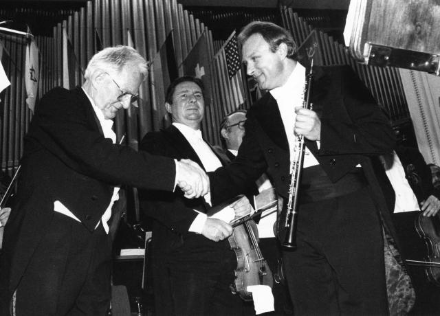 Karol Stryja składa gratulacje Stanisławowi Winiarczykowi po wykonaniu Muzyki na orkiestrę i obój solo Andrzeja Dobrowolskiego wraz z Orkiestrą Symfoniczną Filharmonii Śląskiej.