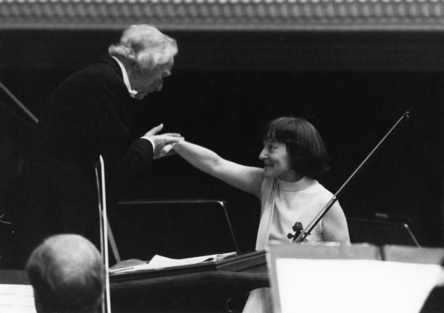 Andrzej Panufnik składa gratulacje Wandzie Wiłkomirskiej po wykonaniu jego Koncertu skrzypcowego wraz ze Scottish Chamber Orchestra.