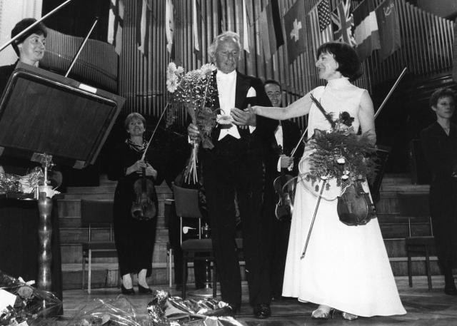Andrzej Panufnik i Wanda Wiłkomirska z kwiatami po wykonaniu Koncertu skrzypcowego kompozytora wraz ze Scottish Chamber Orchestra.