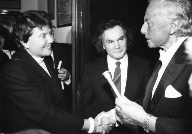 Izabella Cywińska składa gratulacje Andrzejowi Panufnikowi po koncercie, który odbył się 16 września 1990 w Sali Koncertowej Filharmonii Narodowej podczas XXXIII Międzynarodowego Festiwalu Muzyki Współczesnej "Warszawska Jesień". Na zdjęciu widoczny również Kazimierz Kord.
