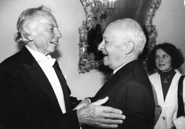 Witold Lutosławski składa gratulacje Andrzejowi Panufnikowi po koncercie, który odbył się 16 września 1990 w Sali Koncertowej Filharmonii Narodowej podczas XXXIII Międzynarodowego Festiwalu Muzyki Współczesnej "Warszawska Jesień".