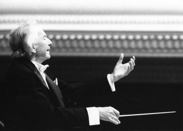 Andrzej Panufnik dyryguje Scottish Chamber Orchestra podczas koncertu, który odbył się 16 września 1990 w Sali Koncertowej Filharmonii Narodowej w ramach XXXIII Międzynarodowego Festiwalu Muzyki Współczesnej "Warszawska Jesień".