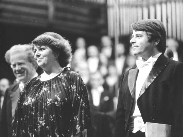 Stanisław Wisłocki, Agata Młynarska and Kazimierz Myrlak on the stage of the Warsaw Philharmonic Concert Hall after the performance of Juliusz Łuciuk's oratorio Francis of Assisi during the 26th Warsaw Autumn International Festival of Contemporary Music.