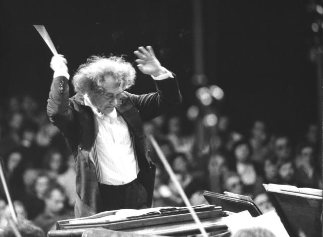 Jerzy Maksymiuk dyryguje BBC Scottish Symphony Orchestra podczas koncertu, który odbył się 27 września 1985 w Sali Koncertowej Filharmonii Narodowej w ramach XXVIII Międzynarodowego Festiwalu Muzyki Współczesnej "Warszawska Jesień".