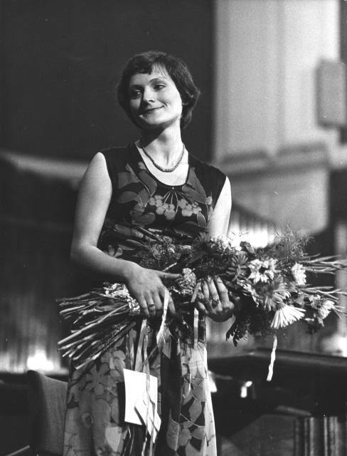 Polish soprano Henryka Januszewska with flowers on the stage of the Warsaw Philharmonic after the performance of Eugeniusz Knapik's Le Chant for soprano and orchestra to texts by Paul Valéra.